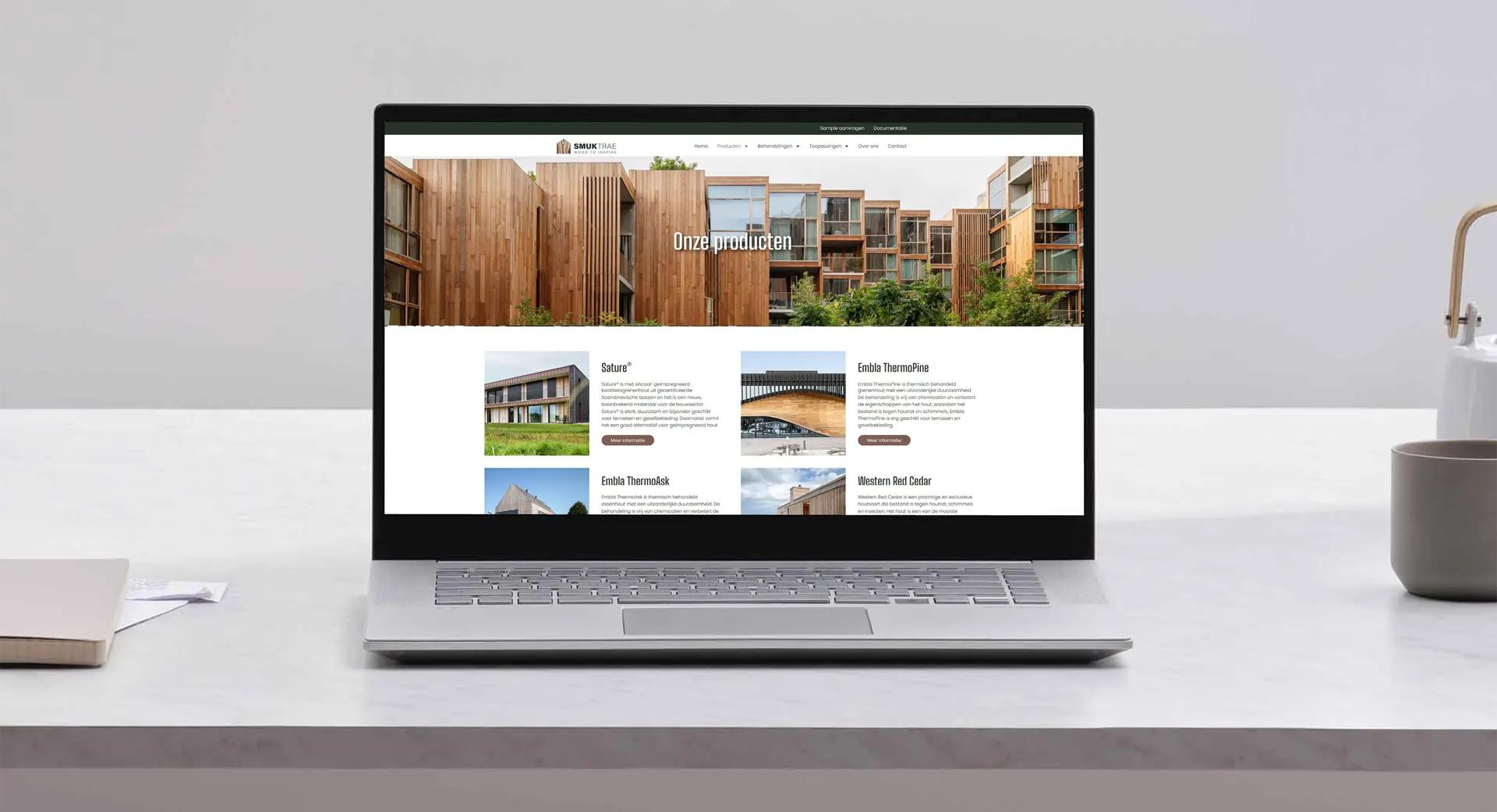 Naast de visuele identiteit bouwden we een volledig nieuwe website, ontworpen om bezoekers direct te overtuigen. Met een gebruiksvriendelijk ontwerp, sterke beelden en pakkende teksten brengt de website de hoogwaardige houten oplossingen van SmukTrae perfect in beeld. De website is niet alleen visueel aantrekkelijk, maar ook geoptimaliseerd voor gebruiksvriendelijkheid en SEO, zodat SmukTrae goed vindbaar is in zoekmachines.