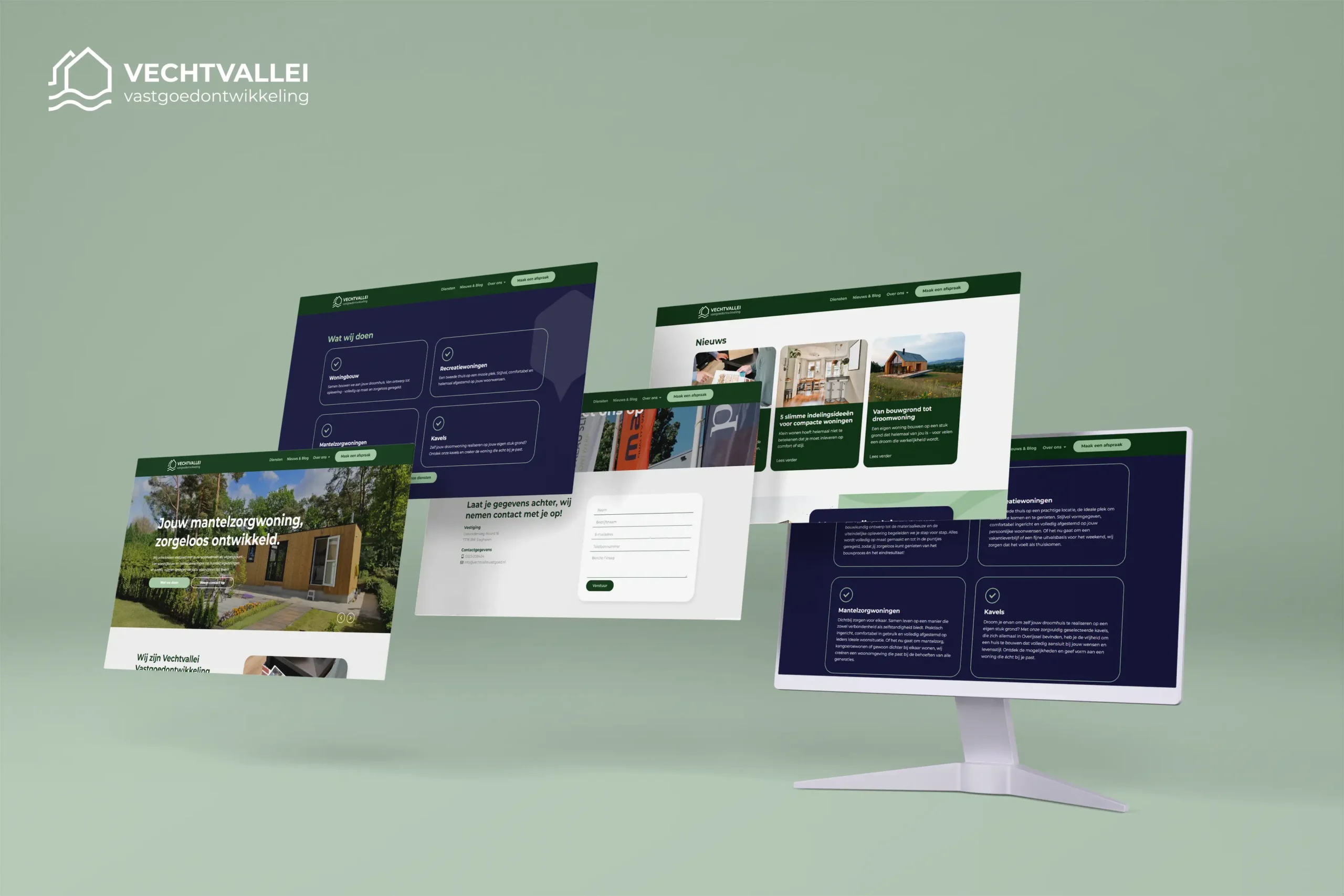 De website moest niet alleen inspireren, maar ook overzicht bieden in het brede aanbod van Vechtvallei. Van vrijstaande woningen en recreatieverblijven tot mantelzorgwoningen en kavels: elk woonconcept kreeg een eigen plek en uitstraling. Bezoekers kunnen eenvoudig navigeren tussen de verschillende mogelijkheden, inspiratie opdoen via beeldmateriaal en kennismaken met de persoonlijke aanpak van Vechtvallei Vastgoedontwikkeling. Alles is vormgegeven in een stijl die rust en vertrouwen uitstraalt, zonder afstandelijk te worden, precies wat je verwacht van een partner die jou helpt bij het realiseren van jouw woondroom.